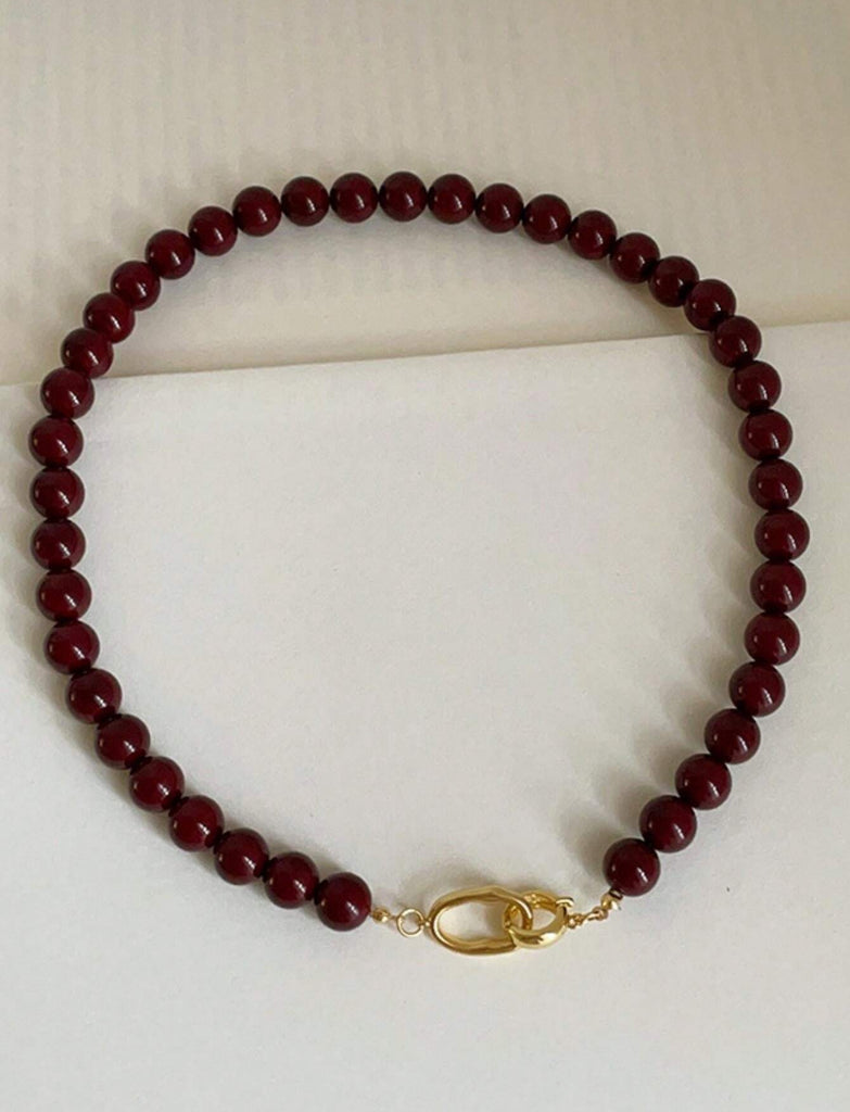 Minar French Dark Red Agate Natural Stone Strand Beaded Necklace For Women Gold Plated Chain Double Toggle Clasp Circle Chokers Plated With 14K Gold Ladies' Daily Party Accessories, Fashionable Jewelry, Best Friend Gifts